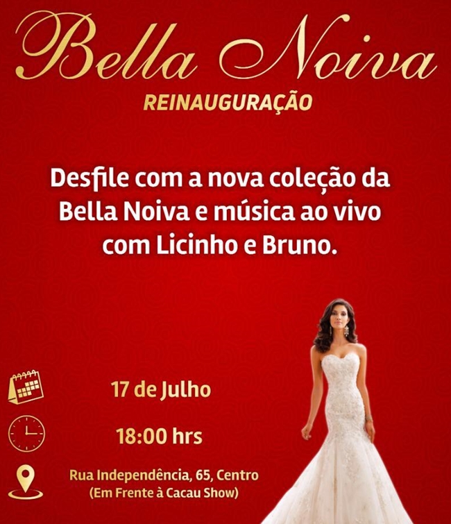 A loja Bella Noiva vai realizar nesta quarta-feira (17), em Delmiro Gouveia, um desfile de reinauguração da loja. O evento conta com a apresentação da nova coleção e show com a banda Lissinho e Bruno.