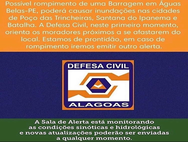 A Sala de Alerta da Defesa Civil de Alagoas está monitorando um possível rompimento, numa barragem na cidade de Águas Belas, em Pernambuco. Ainda de acordo com o órgão, as cidades de Poço das Trincheiras, Batalha e Santana do Ipanema podem ser afetadas.