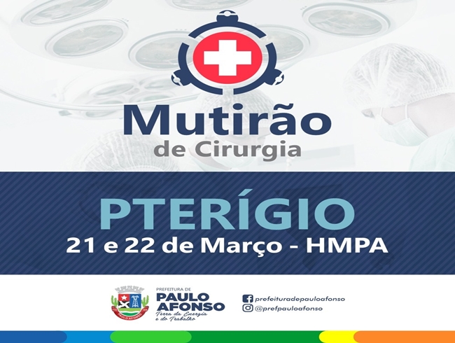 A Prefeitura de Paulo Afonso, por meio da Secretaria de Saúde, realiza mais um mutirão de cirurgia. Desta vez, as intervenções serão para a retirada de pterígio e contempla 200 pacientes. A ação será realizada no Hospital Municipal Aroldo Ferreira (HMPA), no BTN, nos dias 21 e 22 de março.