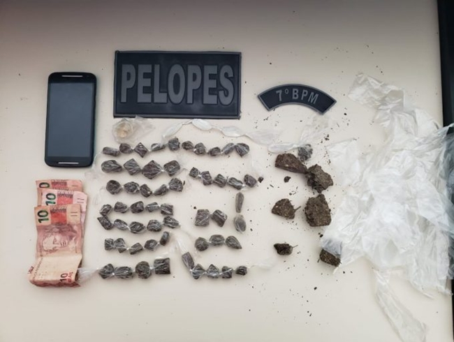 Os militares abordaram um morador em frente à sua casa, e após autorização, os militares fizeram uma busca domiciliar, encontrando uma mochila dentro da geladeira, contendo 55 bombinhas de maconha, 3 saquinhos com cocaína e 2 pedras de crack. Ainda foi achada uma pequena quantia em dinheiro.