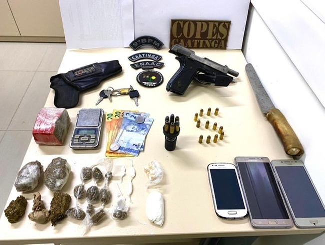 Um jovem de 18 anos acabou sendo capturado e com ele foi encontrado uma pistola calibre 7.65, com seis munições intactas. Ainda na busca do perímetro, os militares descobriram que uma casa servia como ponto de drogas.