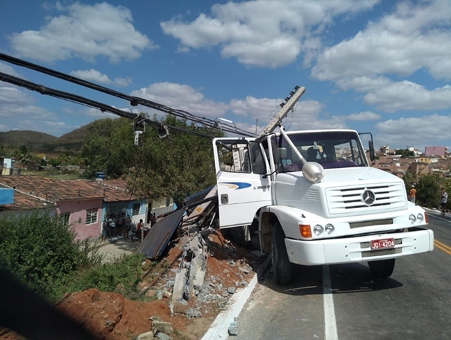 Um caminhão Mercedes Benz, de cor branca saiu da pista e se chocou contra um poste de energia elétrica. A colisão por pouco não termina pior, pois o veículo quase caiu numa ribanceira, que fica perto do riacho Camoxinga.